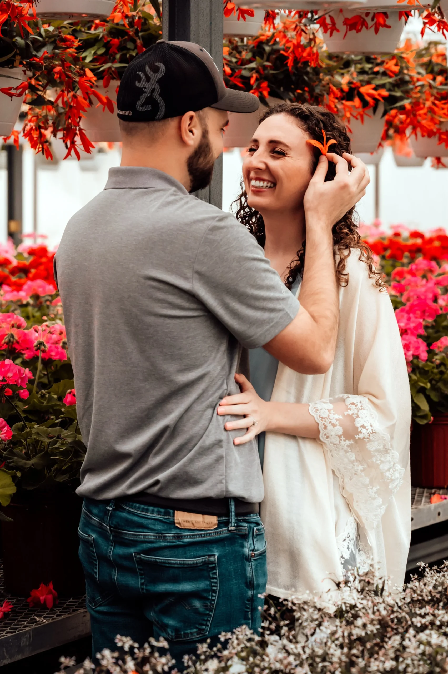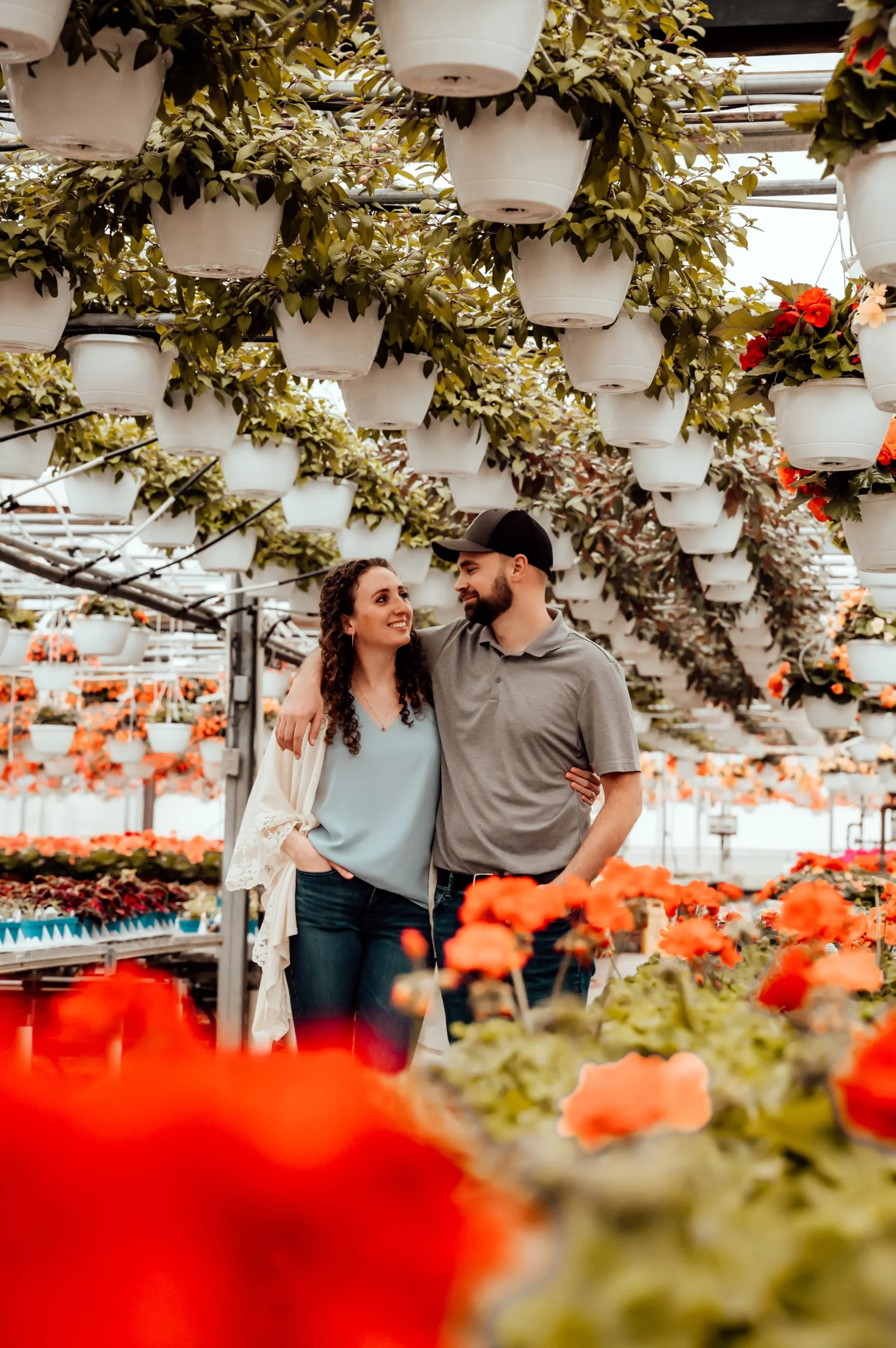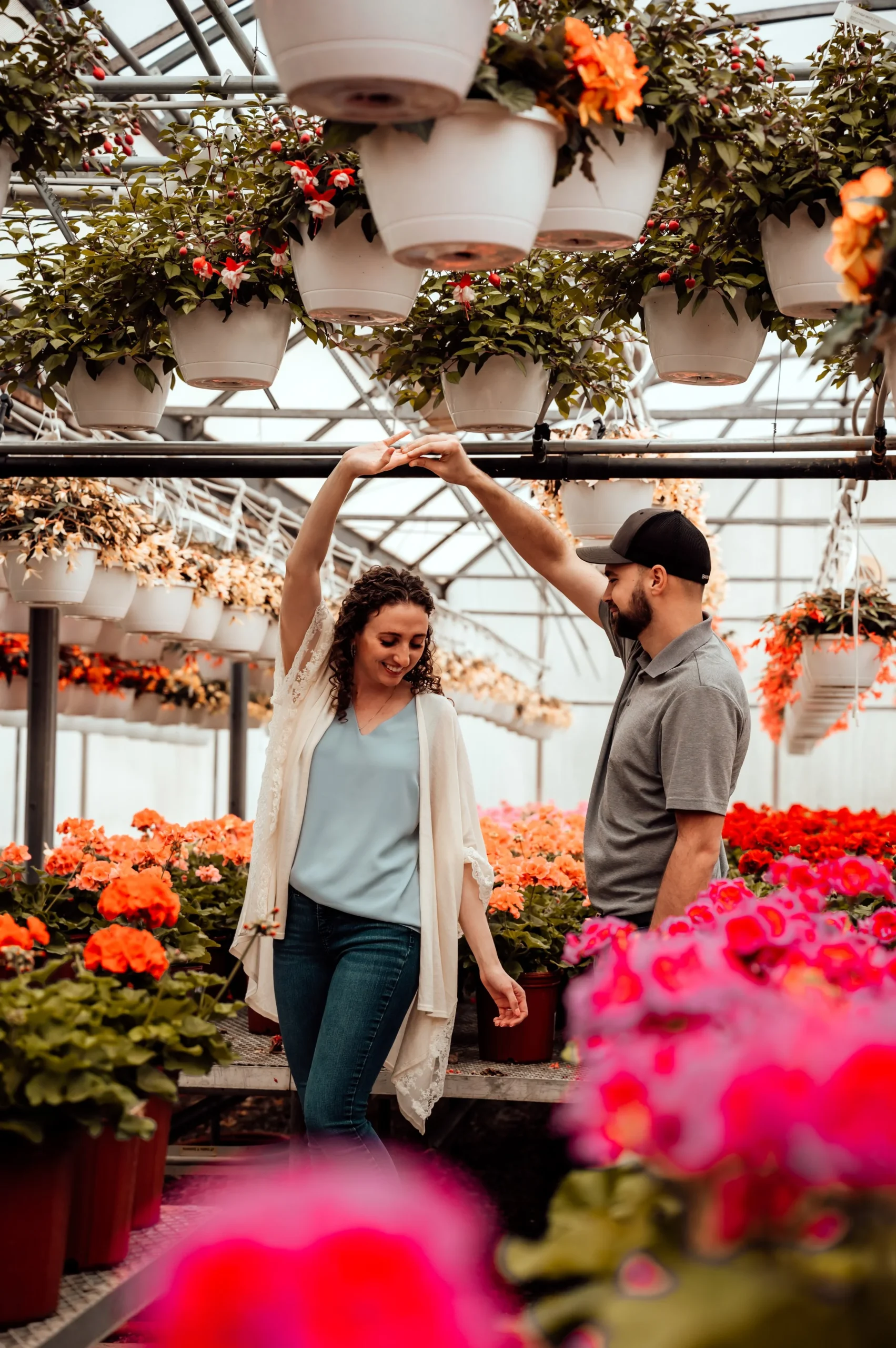 As soon as we stepped into the greenhouse, I knew we were in for a treat. The vibrant, colorful flowers provided a stunning backdrop that simply cannot be replicated. Kalin and Dalton were understandably nervous at first, as many couples are when they first step in front of the camera. But with a little bit of guidance and encouragement, they quickly relaxed and allowed their love to shine through.