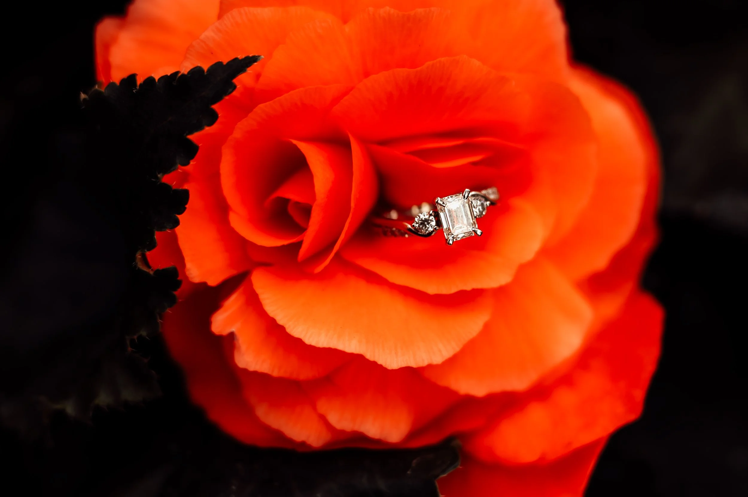 One of my favorite photos from the session was when Dalton spun Kalin around amidst the flowers. The motion created a whimsical effect that perfectly captured the couple’s joy and playfulness. And of course, I made sure to get a few shots of Kalin’s engagement ring nestled among the petals of the most vivid orchids. It was a romantic touch that added even more magic to the day.
