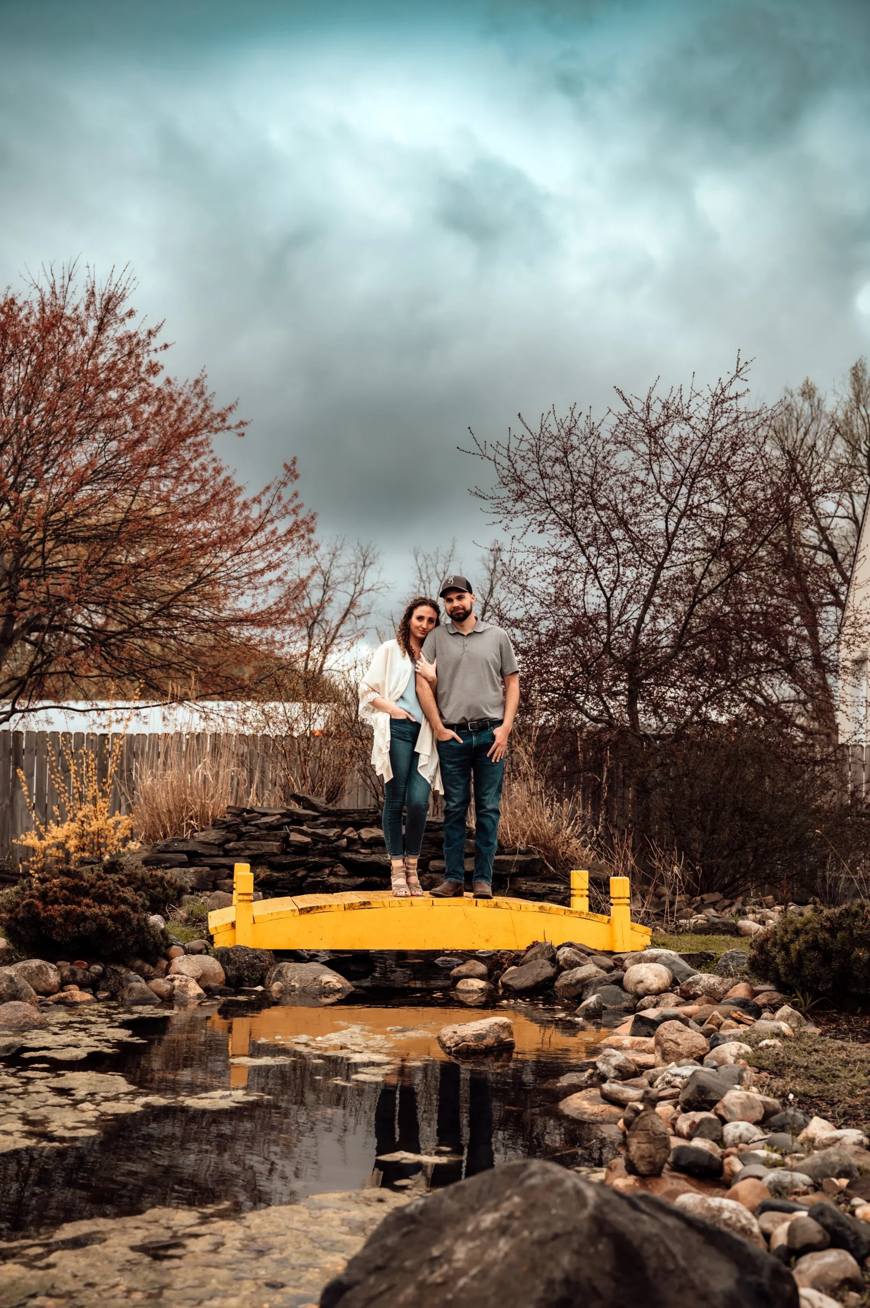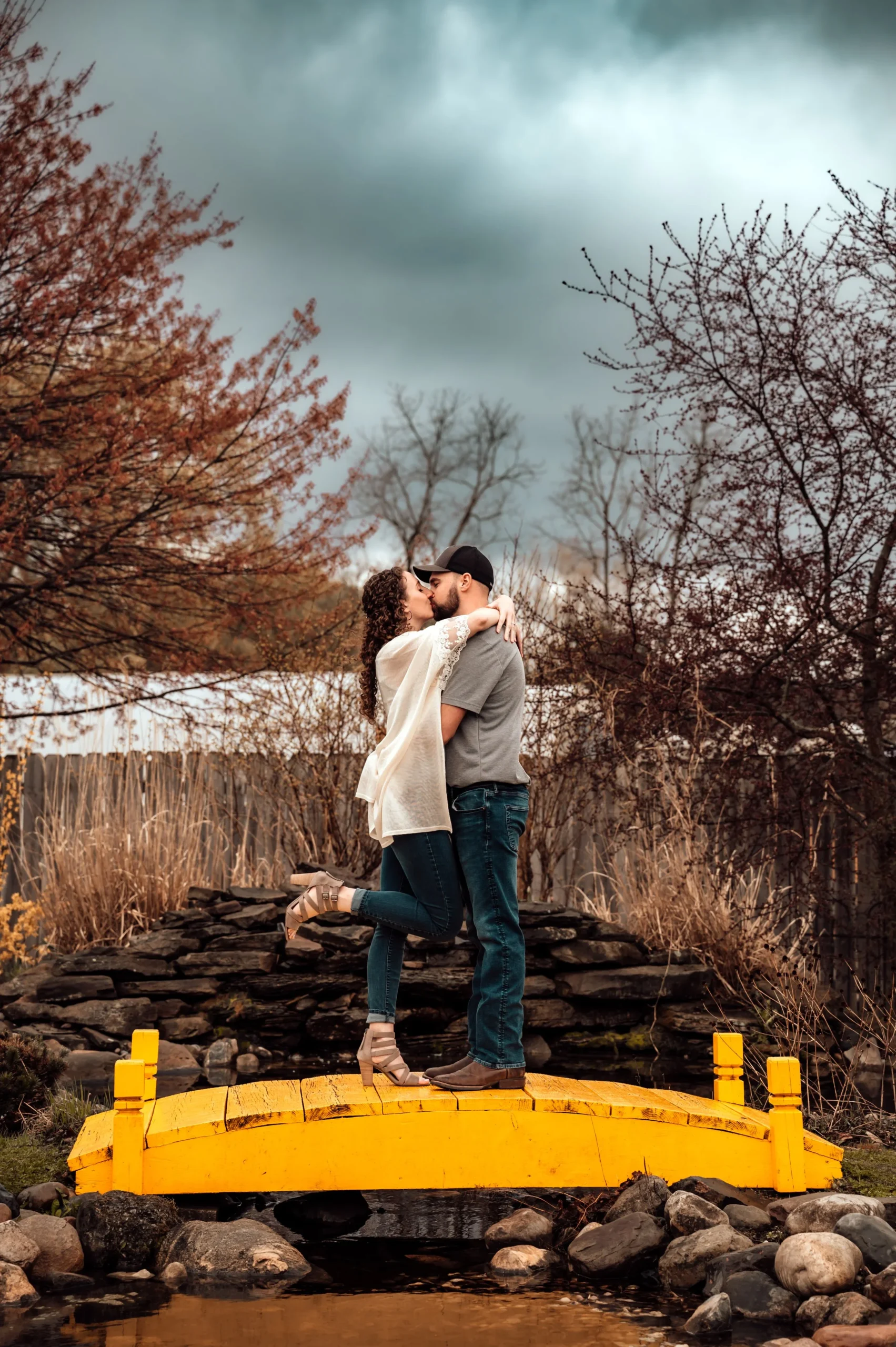 After we finished with the indoor portion of the session, we moved outside to a small yellow bridge with dramatic clouds looming in the background. The contrast between the bright yellow of the bridge and the moody sky created a stunning effect that perfectly complemented the couple’s love for each other.