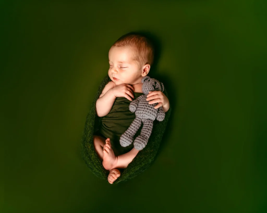 Personal touches made this session truly special. From the woodland-themed nursery in soft blue and green to the bee-themed onesie and felt bee accessory, each element reflected the family’s personality and attention to detail. A grey bear and the baby’s soft blanket added heartwarming props to round out the session.