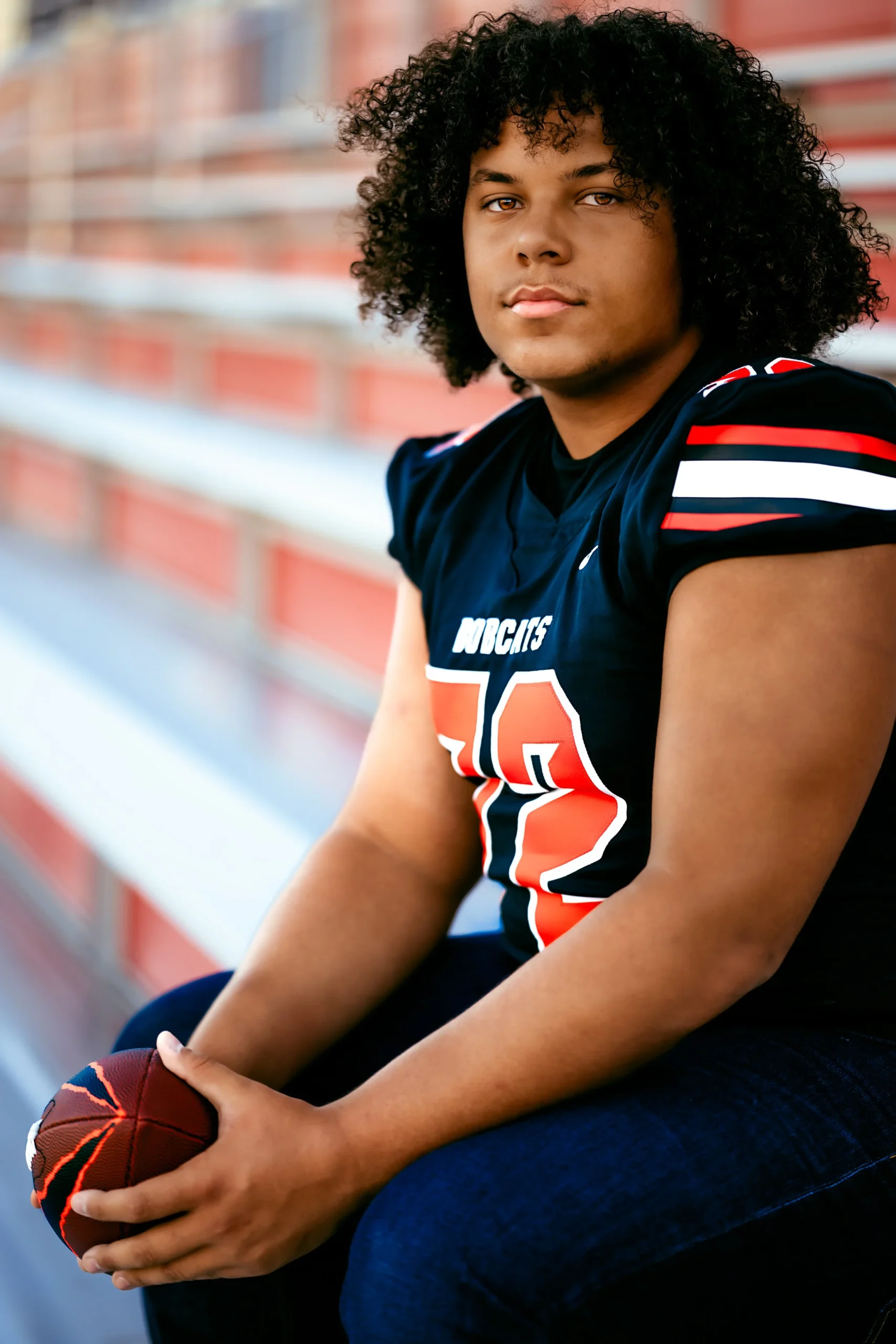 As we continued, Derek brought along his cherished football, a tangible symbol of the countless hours dedicated to perfecting his craft. The contrast of the bold, pigmented leather against the lush green of the stadium’s field created a visual spectacle – a reflection of Derek’s journey from a novice player to a celebrated high school athlete. Each click of the camera didn’t just capture Derek’s physical prowess; it encapsulated the raw emotion and essence of his senior year. It wasn’t a mere documentation of a moment; it was the art of encapsulating an entire chapter of Derek’s life in vivid, bold imagery.